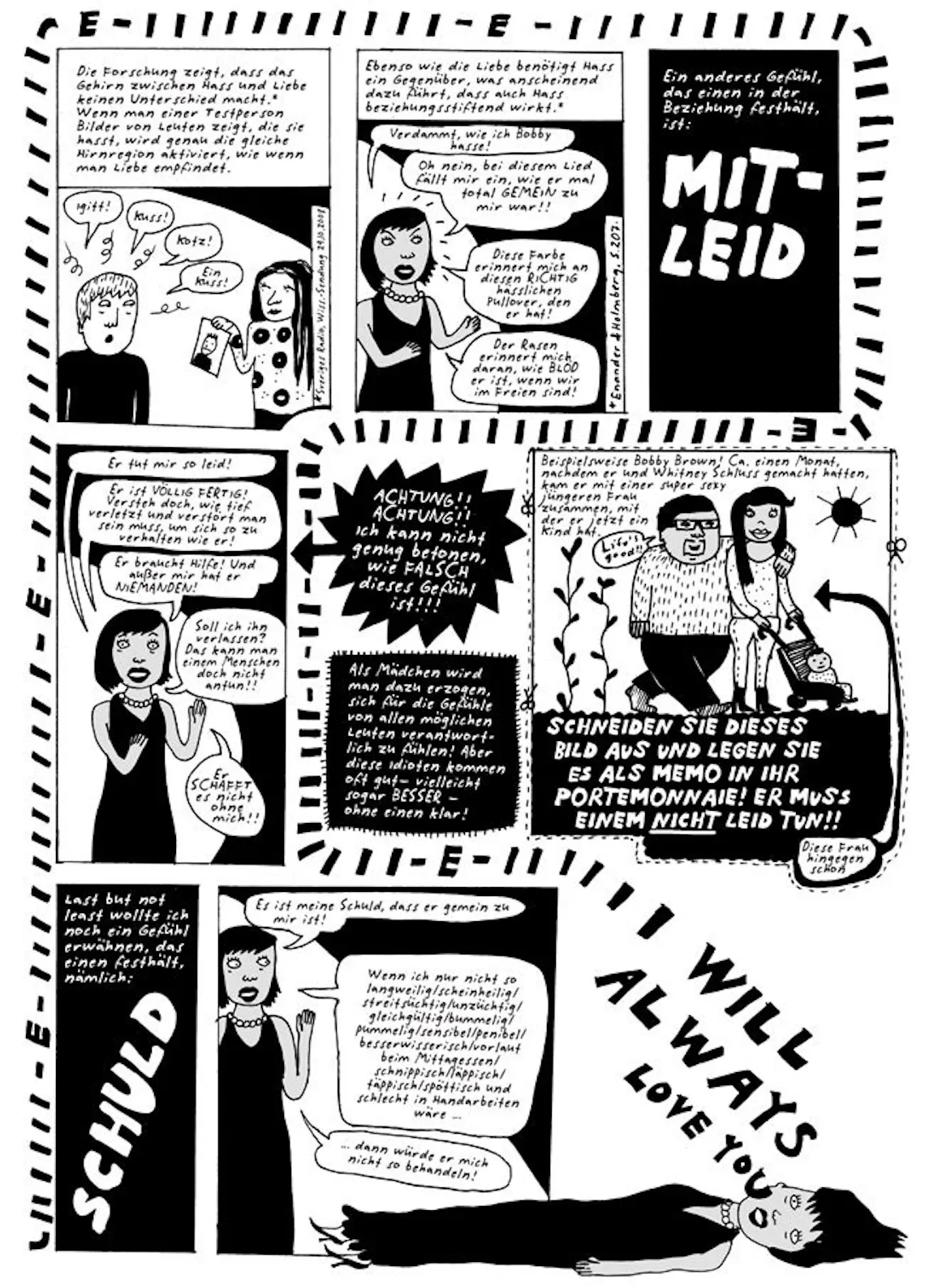 Obwohl sie einem leider auch nicht immer gut tun. Wie man etwa an den tragischen Liebesgeschichten von Whitney Houston und Prinzessin Diana sieht, die hier ebenfalls illustriert wurden. Vor allem der Comic über Dianas Liebeskummer bricht einem das Herz, weil man diesen Schmerz ja selbst so gut kennt. Und weil auch hier diese böse Gesellschaft wieder ihre Folterinstrumente rausholt: „Man muss diese wahnsinnigen Schmerzen einfach hinnehmen“, schreibt Liv Strömquist. „Diese Art von Schmerz passt nicht in unsere Gesellschaft. Es ist sozial inakzeptabel, dermaßen traurig zu sein. Man geht allen furchtbar auf die Nerven. Man weint die ganze Zeit. Dermaßen traurig zu sein, ist ebenso unangemessen wie Alkoholismus: völlig besoffen herumlallen um zehn Uhr vormittags.“