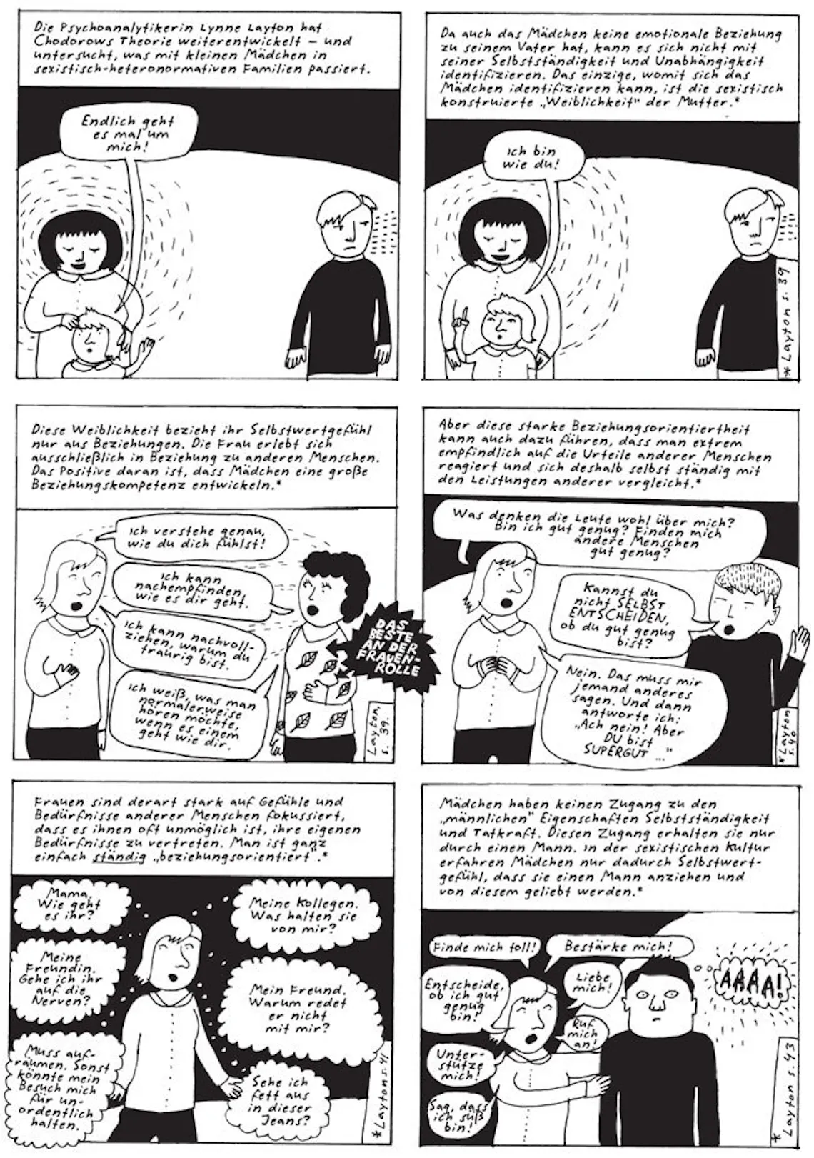 Der Höhepunkt dessen ist ein Bild, auf dem vier Paare nebeneinander auf einem Konzert stehen und jeder Mann seine Freundin von hinten im Arm hält. Sie alle schauen böse, weil die Zeichnerin da grade drüber geschrieben hat, dass auch diese Haltung ein „ritualisiertes Sozialkonstrukt“ sei. „Hä, ein ‚ritualisiertes Sozialkonstrukt‘?“ fragt ein Typ und ein anderer sagt: „Wir stehen hier so, weil wir das MÖGEN!!“ Glaubt man ihm natürlich nicht. Und findet ihn echt albern. Und sich selbst auch, weil man sicher auch schon mal so vorne-Frau-hinten-Mann-mäßig auf einem Konzert rumgestanden ist.
