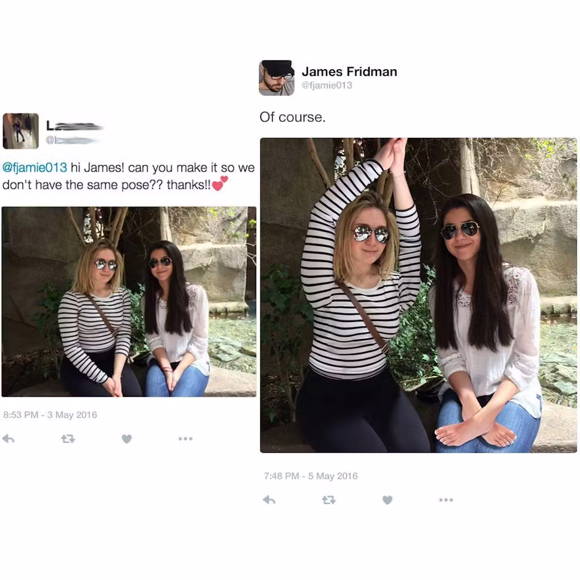 Egal, mit welcher Bitte sich man an ihn wendet – James Fridman hat immer ein "Klar" auf Lager und den richtigen Mausklick im Gefühl. Nach ein paar Minuten Bangen ist dann auch schon das Ergebnis da: "Erledigt" heißt es dann von Photoshop-James. Und man bestaune seine "Meisterwerke", die manchmal vielleicht einen Hauch (oder eher: eine orkanartige Böe) übertrieben sind: