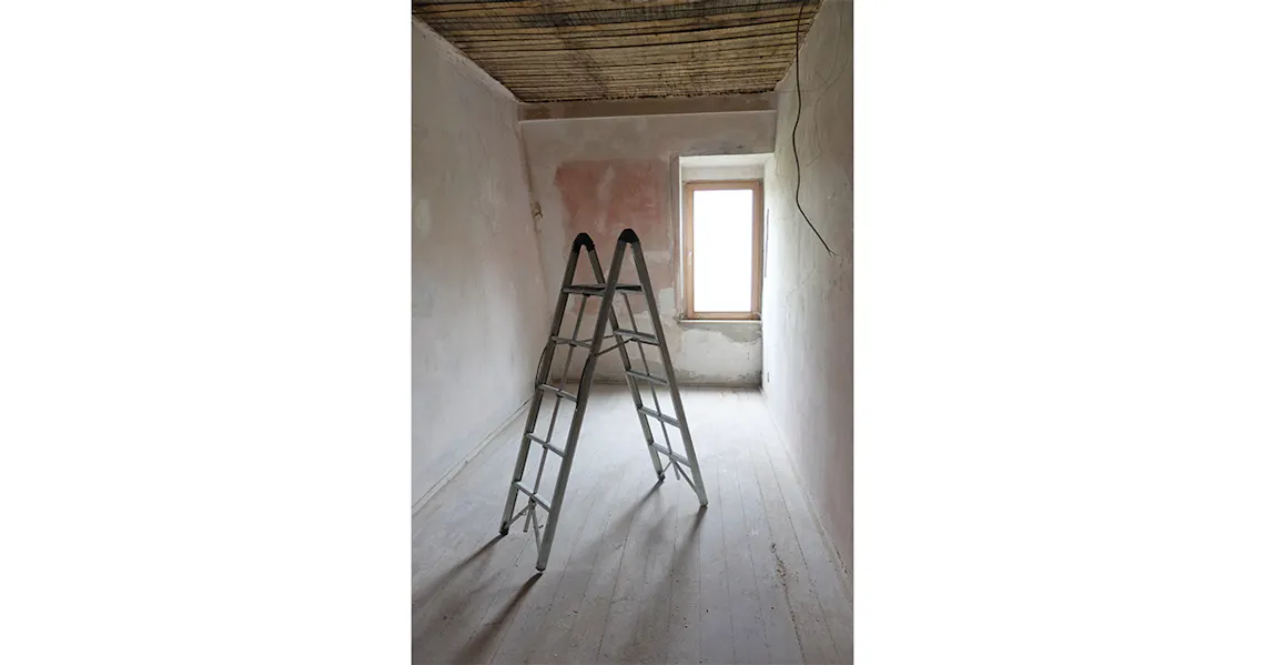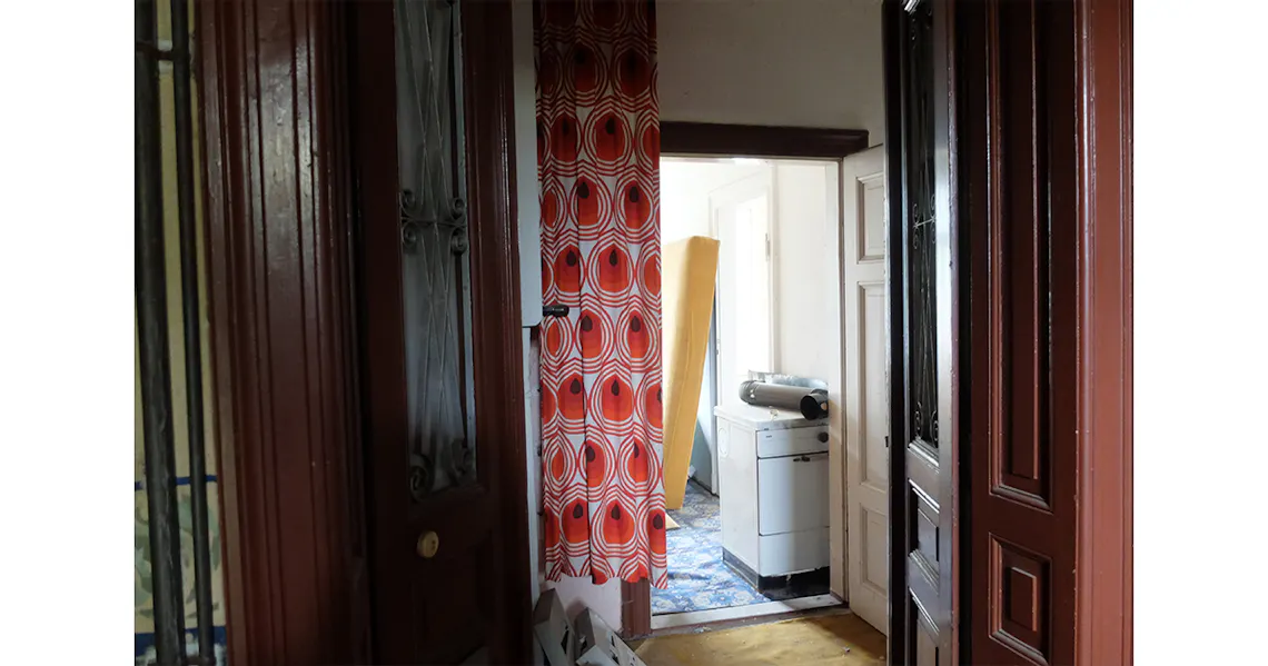 Während Anni und Leo durchs Haus führen, ist Johann im Obergeschoss damit beschäftigt, die alten Dielen wieder freizulegen. Er ist Industriekletterer und Landschaftsarchitekt, er kennt sich aus mit Renovierungsarbeiten. Gerade türmen sich in fast jedem Raum noch Besitztümer der früheren Mieter*innen. Da steht ein geblümtes Sofa vor vergilbter, halb abgerissener Tapete. In einer ehemaligen Küche stapeln sich Putzmittel, da hängen Suppenkellen über alten Auflaufformen und Eierkartons, die seit wahrscheinlich 15 Jahren nicht vom Fleck bewegt wurden. Warum die früheren Bewohner*innen ihre Sachen nicht mitgenommen haben, wissen die jetzigen Besitzer*innen auch nicht. Jetzt versuchen sie, möglichst viel mit dem zu arbeiten, was da ist. Immer wieder zeigen Anni und Leo auf bestimmte Gegenstände: „Das könnte man noch gut brauchen“, sagen sie, „Den Teppich könnten wir in die Küche legen.“ Im obersten Stockwerk sind die Räume schon ausgeräumt, hier fällt Licht auf alte Dielen, in den Ecken stapelt sich Schutt. Bis alle einziehen können, wird es wahrscheinlich noch bis März 2021 dauern.