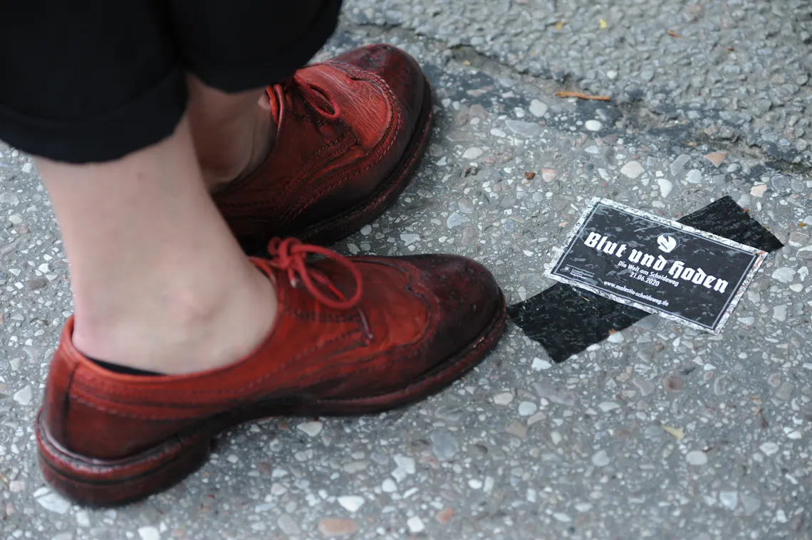 Einige Hundert Meter weiter erinnert eine Performance in einem Hinterhof an Frauen, die gewaltsam sterben mussten. Sie stammten aus Iran, Afghanistan, Mexiko, Kolumbien. Ihre Portrait-Bilder liegen auf dem Boden, um eine große Vulva aus Erde herum, geschmückt mit Blumen und Früchten. „Wenn du eine von uns angreifst, greifst du alle an“, heißt es in einem Video, das davor abgespielt wird. Während die Teilnehmerinnen Konfetti auf die Vulva streuen und diese später mit Rotwein begossen wird, schaut ein weißer junger Mann neugierig aus seinem Fenster auf den angrenzenden Innenhof.