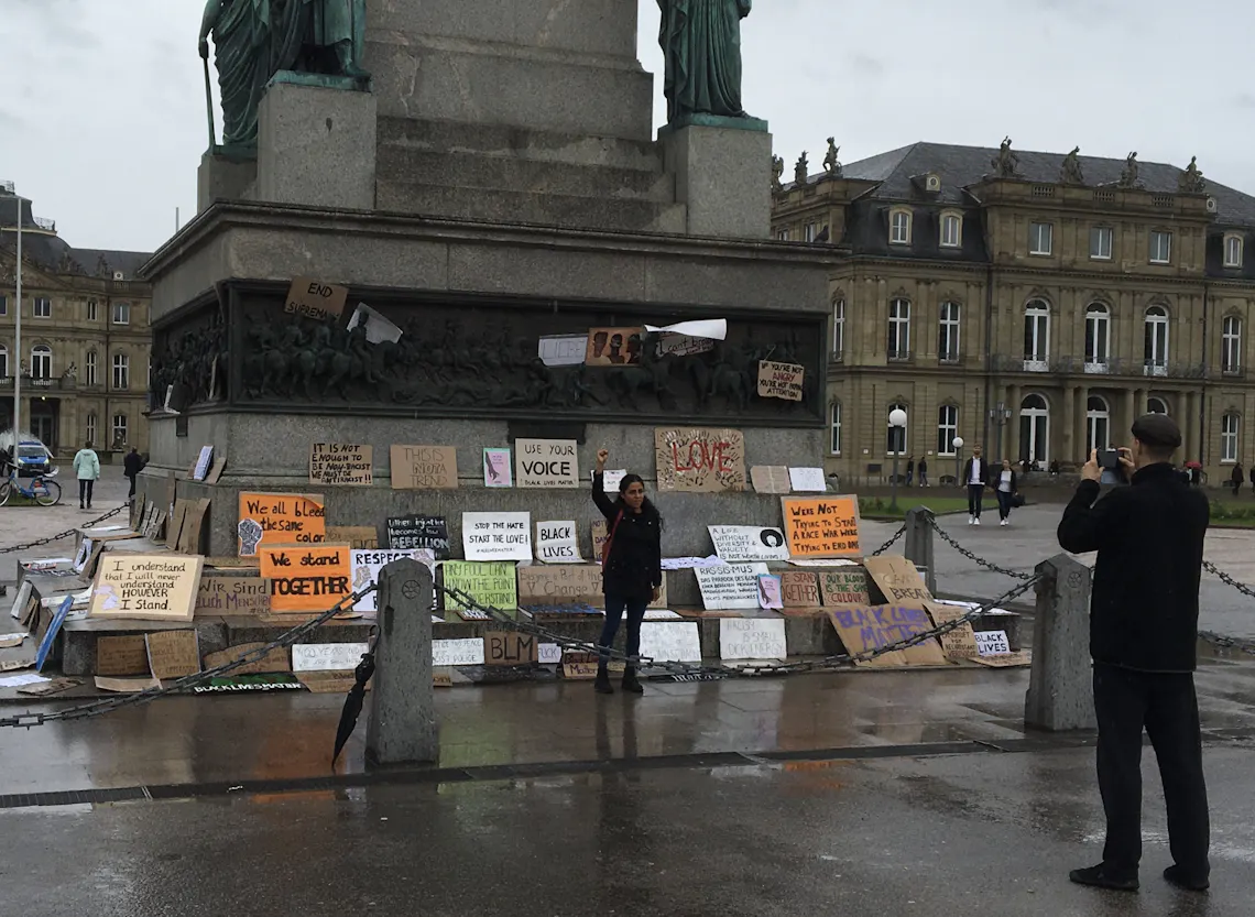 Die öffentlich-rechtlichen Medien sprechen später von 10 000 Demonstrierenden in Stuttgart. Auf der „Silent Demo“ in München sollen es sogar 25 000 gewesen. „Wir haben so viele Leute mobilisiert, das ging alles so schnell.“ Nadia will weiter machen, weiter Demonstrationen organisieren. „Wir haben die Menschen heute daran erinnert, dass wir alle gleich sind“, sagt sie. Mittlerweile ist es 18 Uhr, es sind nur noch wenige Menschen im Oberen Schlossgarten. Vor der Bühne tanzt eine Gruppe junger Schwarzer zu Beats, die auf einer Bluetooth-Box abgespielt werden. Ihre Schilder legen die Demonstrierenden überall in der Stadt aus.