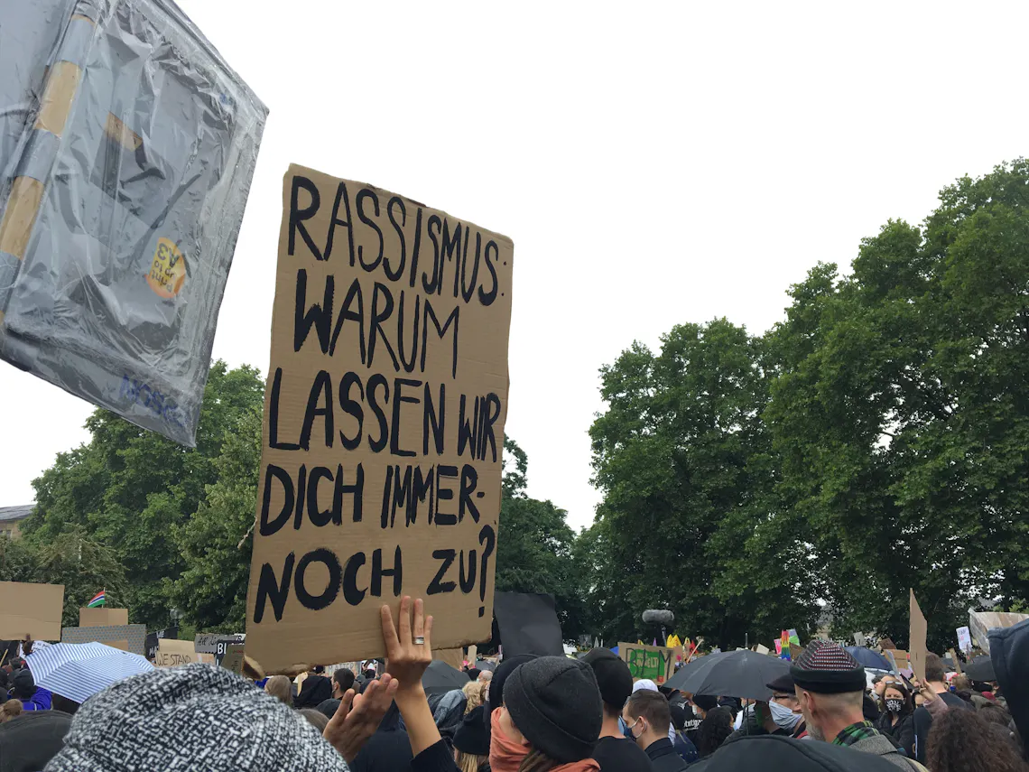 Auf der Bühne erzählen Schwarze Menschen von ihren Erfahrungen mit Rassismus. Links neben der Bühne steht Samuel, ein junger Schwarzer, der in Wirklichkeit anders heißt. Er trägt ein „Nazis raus“-Patch auf seiner Jeans-Jacke und weint minutenlang, während eine junge Frau auf der Bühne erzählt, dass sie als kleines Mädchen in der Badewanne versucht habe, ihre braune Haut abzuwaschen, weil sie im Kindergarten gehänselt wurde. Ein Schwarzer Mann mittleren Alters läuft durch die Menschenmenge und filmt die Schilder, die die umstehenden Menschen hochhalten. Er streamt das Video live und spricht dabei in sein Smartphone: „Es ist 2020, ich kann es nicht glauben, dass ich immer noch für unsere Rechte im Regen stehen und demonstrieren muss“. Franc ist 33. Der Schwarze Mann mit Wurzeln in Kamerun sagt: „Ich bin hier, weil Rassismus, Polizeigewalt und Racial Profiling endlich ein Ende haben müssen.“ Nadine ist 31 und sagt: „Ich lebe seit 30 Jahren in Deutschland, ich habe zwei Kinder. Und ich will ein Zeichen setzen gegen Hass und Diskriminierung.“