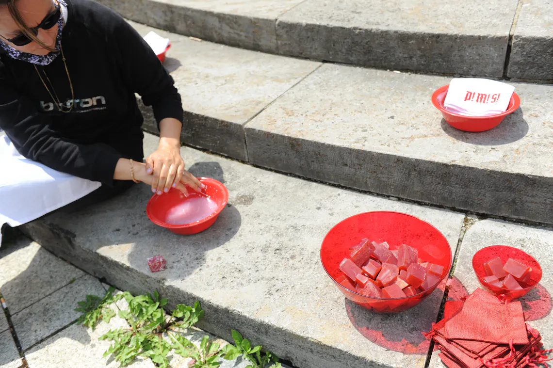Teil der Performance: Die Teilnehmerinnen können sich aus der Menstruationstasse lesen lassen – und so einen Einblick in die Zukunft bekommen.