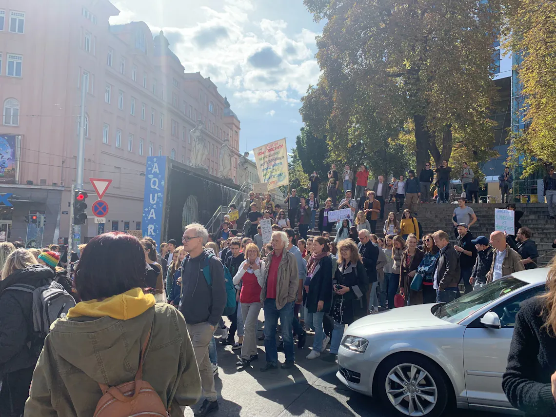 Singend und tanzend schiebt sich die Menschengruppe durch die enge Barnabitengasse im 6. Wiener Gemeindebezirk. Sie wird sich in dieser einzigartigen Konstellation wohl nicht wieder zusammenfinden. Unter den Demonstranten sind vor allem Schüler und Studenten, aber auch: Anzugträger, Senioren, Unternehmer. Es ist ein kleiner Querschnitt der Gesellschaft, der am Freitagnachmittag, am Tag des großen Klimastreiks, in Richtung der Mariahilferstraße zieht, einer der Haupteinkaufsmeilen in Wien. Etwa 300 Leute sind zu diesem Demonstrationszug gekommen, es ist eine der 25 Veranstaltungen, die „Fridays for Future Wien“ im ganzen Stadtgebiet organisiert hat.
