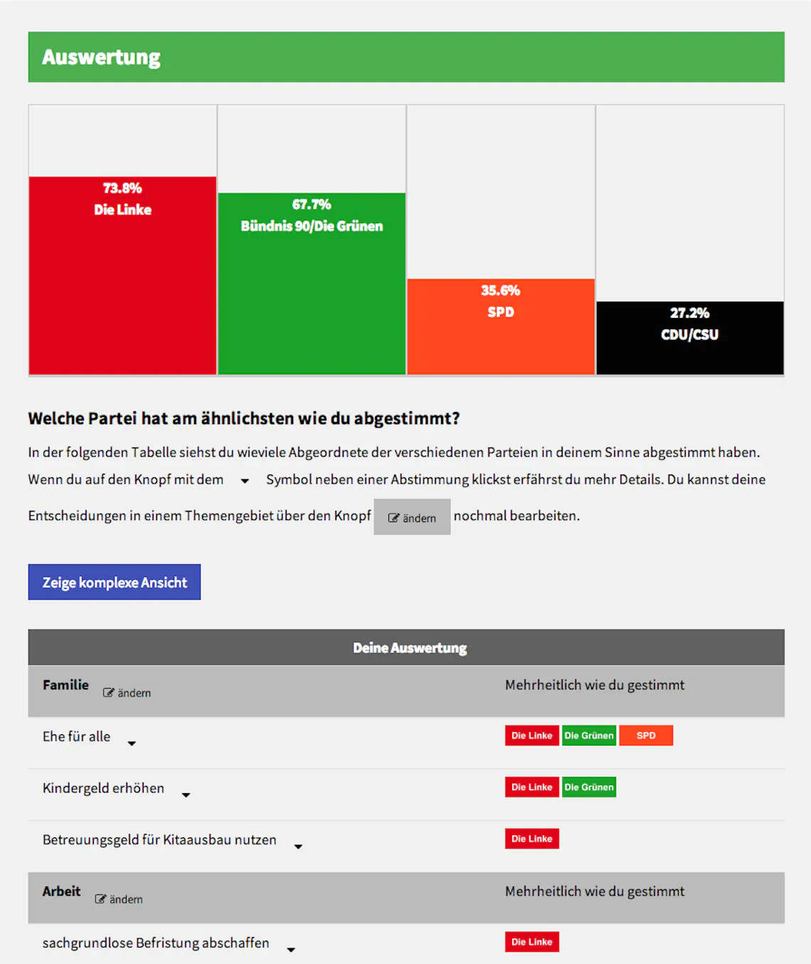 Zwar ist reichlich Infomaterial verlinkt und einige Fragen werden auch einleitend erklärt, aber die Sprache ist sehr technisch, wie die der Berufspolitiker. Die Begrifflichkeiten sind nicht immer einleuchtend, die Thematik hochkomplex, man braucht ziemlich viel Hintergrundwissen. Außerdem wird ausschließlich auf Parteien Bezug genommen, die in der vergangenen Wahlperiode im Bundestag vertreten waren. Das ist logisch, weil auch nur sie an Abstimmungen teilgenommen haben – aber auch problematisch. Sowohl die FDP als auch die AfD sind bei DeinWal.de ausgenommen, obwohl beide reelle Chancen haben, im September erneut beziehungsweise erstmals in den Bundestag einzuziehen. Eine vorwärtsgerichtete Wahlentscheidung aufgrund von zurückliegenden Abstimmungen zu treffen, scheint zudem wenig sinnvoll – auch die Haltungen der Parteien können sich ändern!