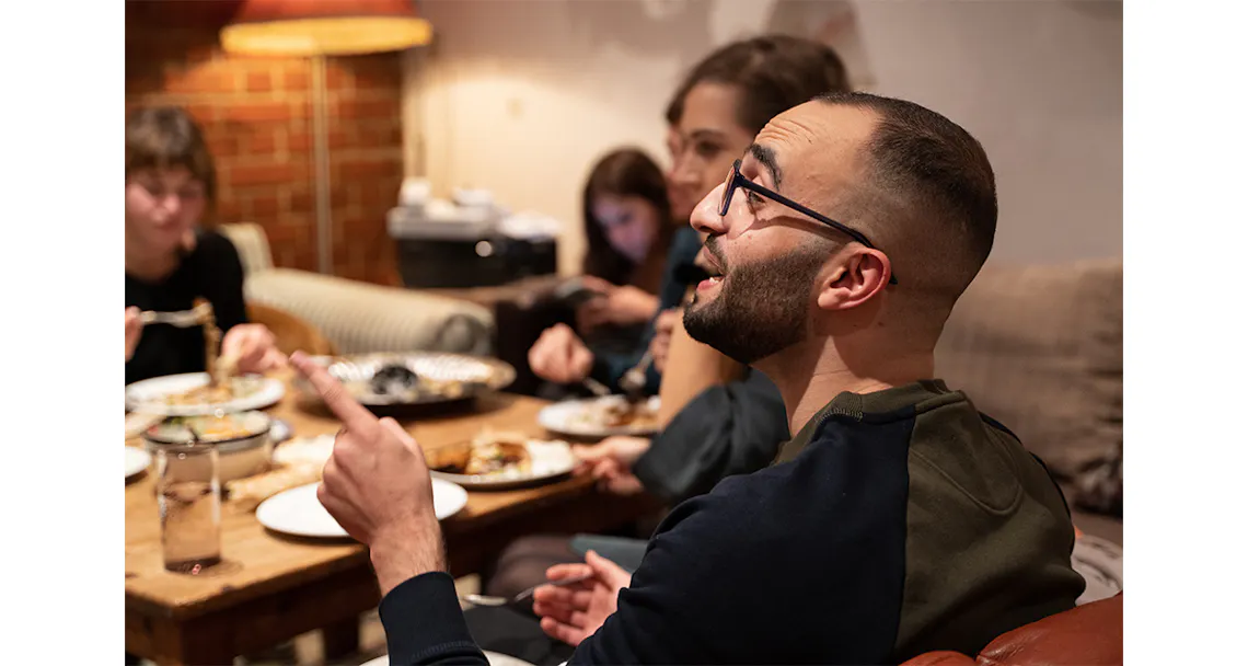 Vor Mohammeds Einzug hatten sich seine zukünftigen Mitbewohner*innen Gedanken gemacht, die sie sich bei Bewerber*innen ohne Fluchtgeschichte nie gemacht hatten. „Wir haben befürchtet, dass er sich eher zurückzieht und wir nicht so ein cooles Miteinander haben. Aber das hat vielleicht zwei Tage gedauert und die Bedenken waren weg“, erzählt der ehemalige Mitbewohner Paul. Als Mohammed das erste Mal für alle kochte, saßen etwa 30 Leute an einer langen Tafel auf dem Boden. Die Fotos von diesem Abend hängen neben vielen anderen WG-Erinnerungen über Mohammeds Schreibtisch. Das Kennenlernen sei sehr spannend gewesen, sagt Mitbewohnerin Eva. Mohammed erzählte viel von Syrien und korrigierte damit so manche falsche Vorstellung, die seine Mitbewohner*innen vom Leben dort hatten. Auch Pauls Befürchtung, es könne ein Thema sein, dass Mohammed Muslim ist, stellte sich bald als unbegründet heraus. Dass Mohammed bei WG-Partys oft als einziger von 200 Leuten keinen Alkohol trank, hinderte ihn ja nicht daran, zu tanzen und zu feiern.