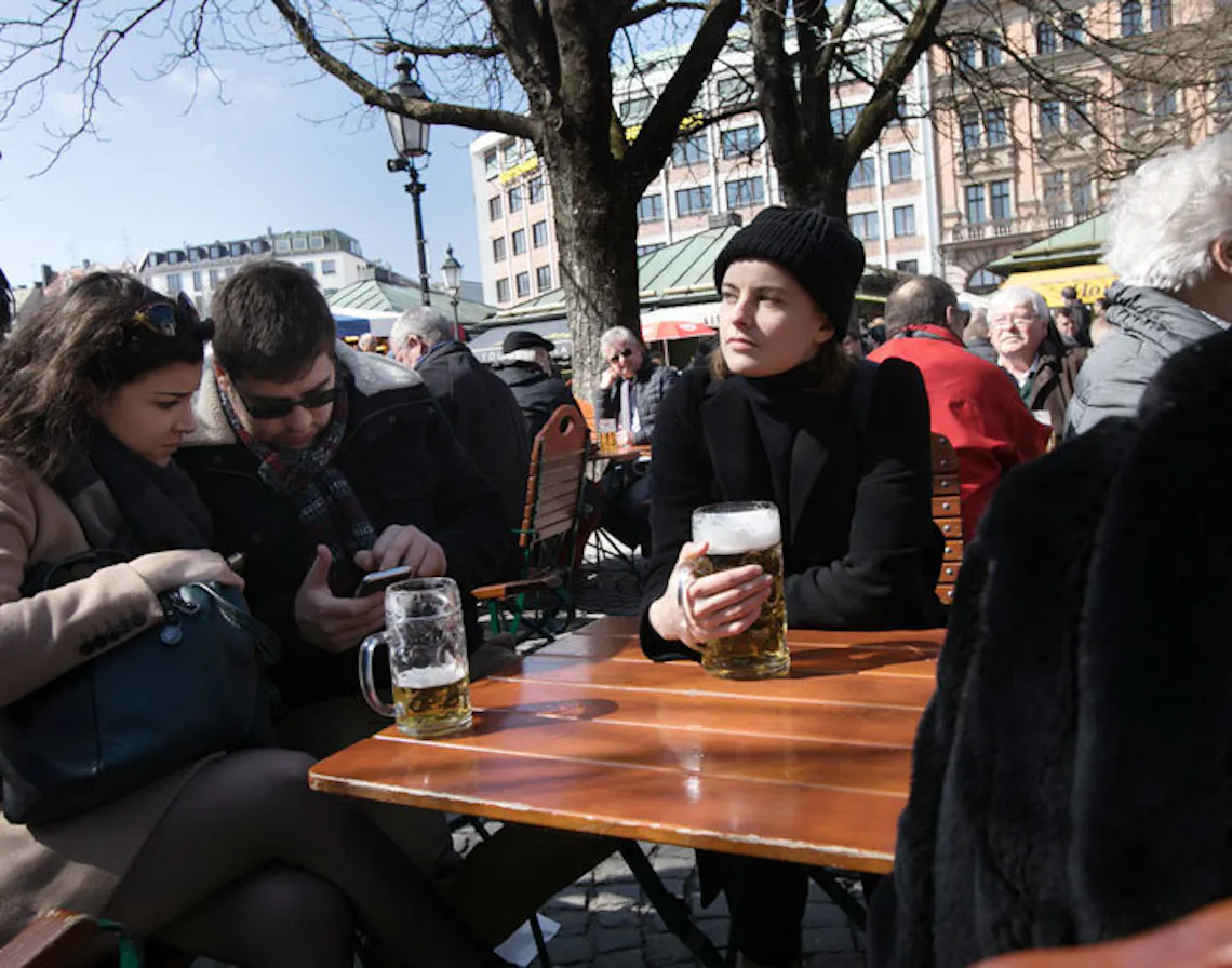 Dann eben gleich Viktualienmarkt, der alte Touri-Magnet, und im Biergarten eine Radlermaß bestellen. Auf dem Markt kaufe ich oft Käse und Gemüse, aber in den Biergarten setze ich mich nie, weil Hypothese: Touristenfalle! Tatsächlich aber sitzt hier eine erstaunlich ausgewogene Mischung aus Einheimischen und Gästen. Und diese ausgewogene Mischung ist ja gerade so ein typisches Münchending: Man staunt jedes Jahr auf der Wiesn wieder drüber oder wenn man sich einmal in drei Jahren ins Hofbräuhaus verirrt.
